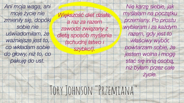 Książkę kupiłam na ostatniej konferencji. Nie powiem, żebym przeczytała jednym tchem, ale Tory pisze święta prawdę, pod którą podpisuję obiema rękami – odchudzanie siedzi w Twojej głowie.