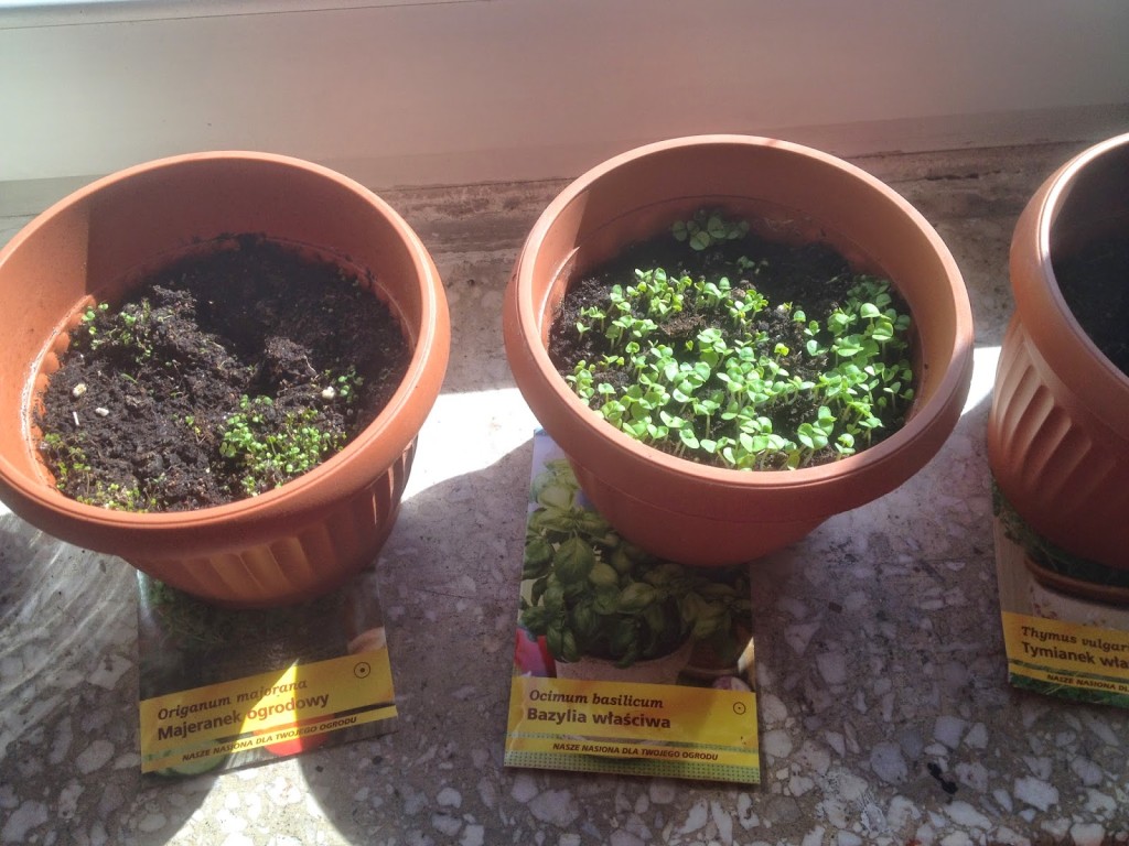 Wracając jednak do uprawy ziół. Jeśli robiliście to w kubeczkach po jogurtach, to teraz jest dobry czas, żeby jednak roślinki przesadzić do większych doniczek, w których docelowo będą rosły. Niestety nie mam zdjęć instruktażowych, ale to niezwykle prosta czynność, więc na pewno sobie poradzicie! A w wakacje rozpoczynamy zbiory!Jak widać na zdjęciach, nie poddałam się tak łatwo, i w ruch poszła zapas nasiona. Tym razem majeranek, tymianek i bazylię, posadziłam od razu w doniczka. To znaczy nie, a mój Mąż. I jak widzicie gonią pietruszkę!